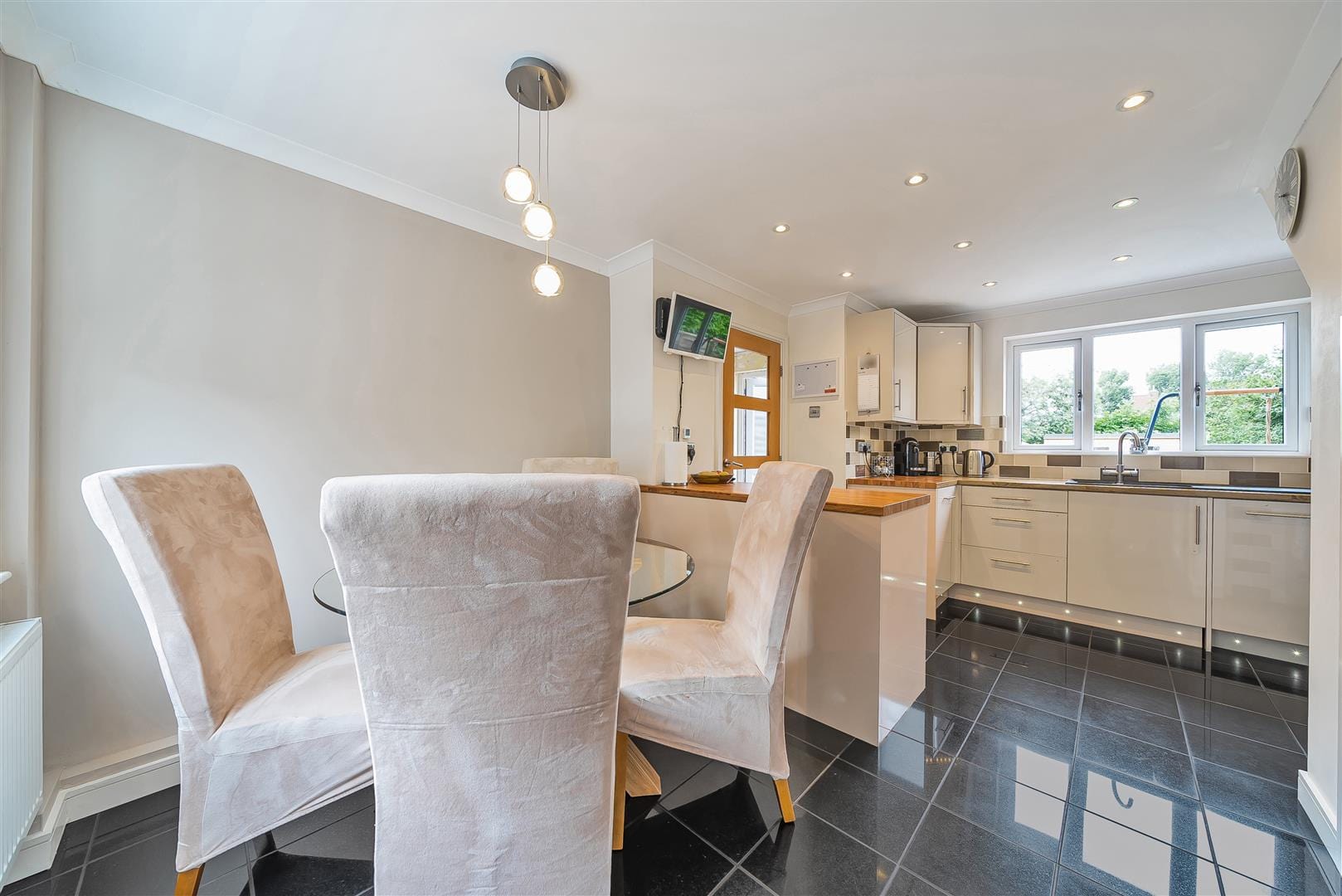 With a modern range of wall, base and drawer units with wooden worktops and tiled splash back. Plinth lighting. One and a half bowl sink and drainer unit with mixer tap over. Built-in dishwasher, built-in oven hob and extractor fan. Under stairs cupboard, breakfast bar, tiled flooring radiator, double glazed window to front.