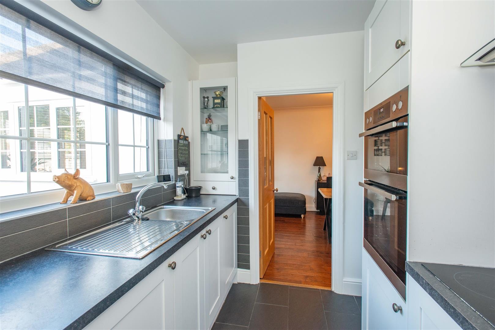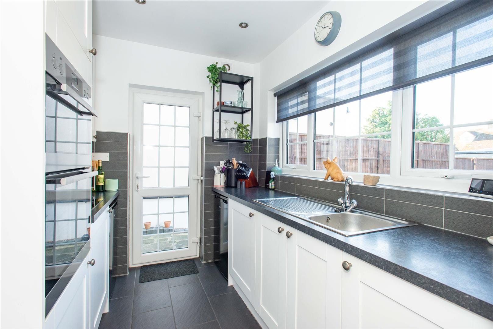 Fitted with a range of modern wall, base and drawer units, with work surfaces and inset stainless steel single bowl single drainer sink unit. Tiled splash back and ceramic tiled flooring. Integrated kitchen appliances including: electric oven and hob, with extractor hood above; and washing machine. Space for freestanding under-counter fridge, and under counter freezer. Double glazed window overlooking the rear garden, and with double glazed door to the side.